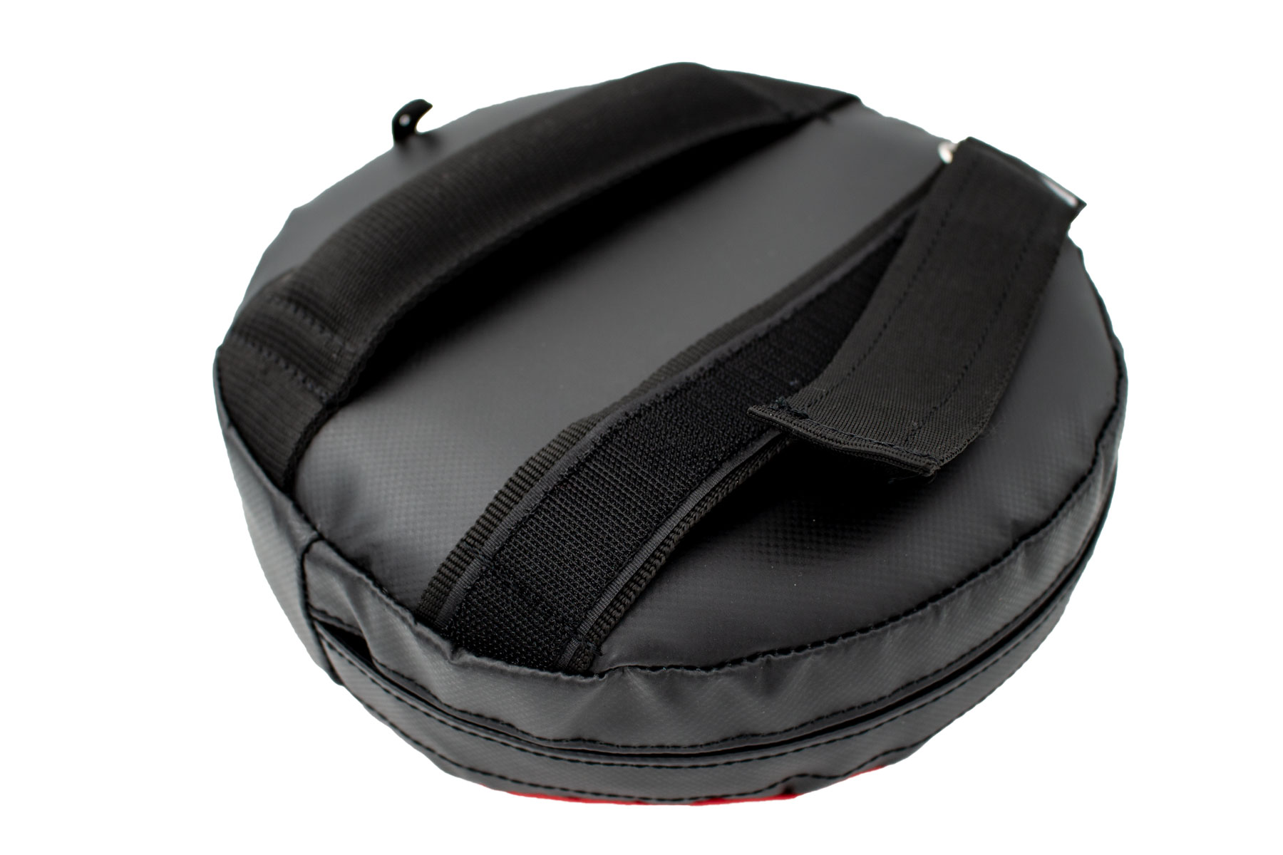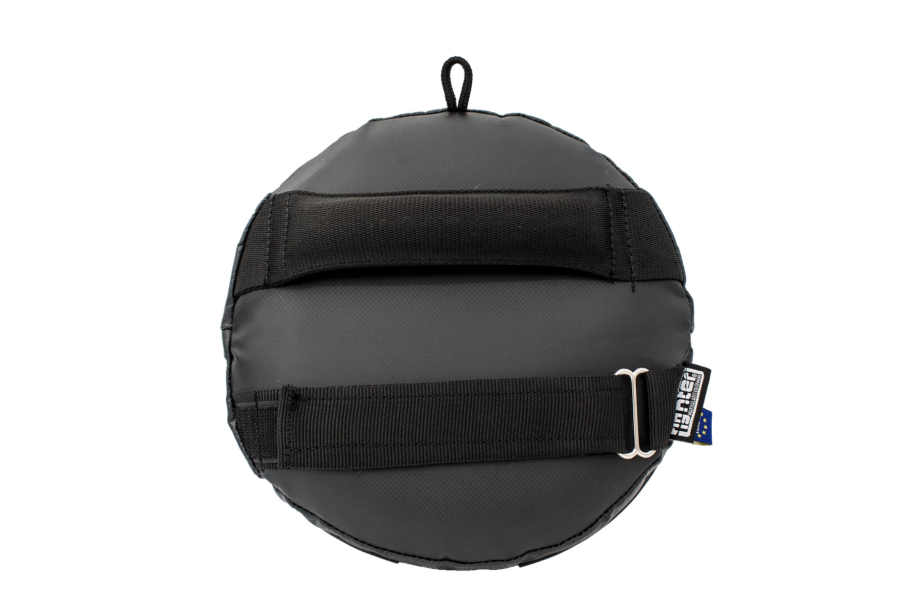 La « Mini Target » de la maison Hayashi est peu encombrante et très pratique à utiliser. Sous la robuste housse en similicuir se trouve un noyau en mousse indéformable qui assure une sécurité suffisante des deux côtés du punch pad. Pour permettre un changement rapide de position, le « Mini Target » possède au dos une barre de maintien rembourrée ainsi qu’une sangle supplémentaire en scratch. Le domaine d’utilisation du Mini Tampon de frappe Hayashi s’étend des premiers coups de poing et de pied dans l’entraînement des enfants et des jeunes jusqu’aux exercices de précision chez les professionnels.