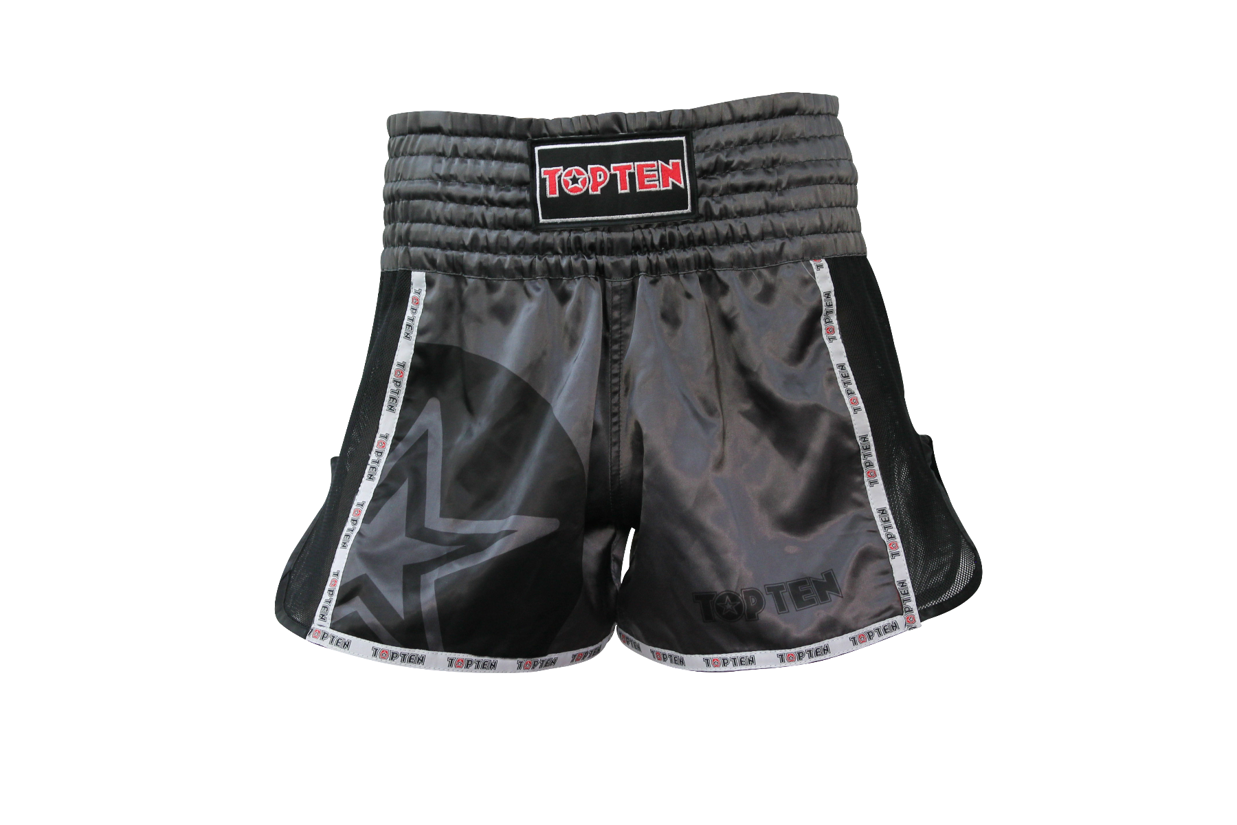 Avec le « Star » de TOP TEN, tu peux sentir de près ce qui fait un bon short de boxe thaï. Ce short fonctionnel est entièrement dédié aux exigences des sports de combat. Une coupe extra courte et des side-cuts supplémentaires en font un véritable artiste du mouvement. Pour que le « Star » reste toujours en place, il est équipé d’une ceinture de près de 9 cm de large. TOP TEN assure une grande variété de couleurs pour ce modèle. Sur le matériau en polyester lisse et légèrement brillant, les couleurs et les motifs sont directement sublimés dans le tissu. Grâce aux empiècements latéraux en mesh, le « Star » est un véritable poids plume avec une excellente gestion de la température.